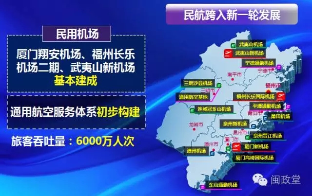 民航計(jì)劃完成投資800億,廈門翔安機(jī)場(chǎng)、福州長樂機(jī)場(chǎng)二期、武夷山新機(jī)場(chǎng)基本建成,通用航空服務(wù)體系初步構(gòu)建。全省民航旅客吞吐量突破6000萬人次。