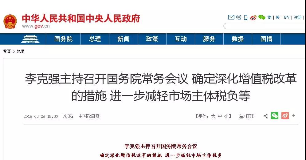 2018年3月28日國(guó)務(wù)院常務(wù)會(huì)議決定,將制造業(yè)等行業(yè)增值稅稅率從17%降至16%,將交通運(yùn)輸、建筑、基礎(chǔ)電信服務(wù)等行業(yè)及農(nóng)產(chǎn)品等貨物的增值稅稅率從11%降至10%,預(yù)計(jì)全年可減稅2400億元。